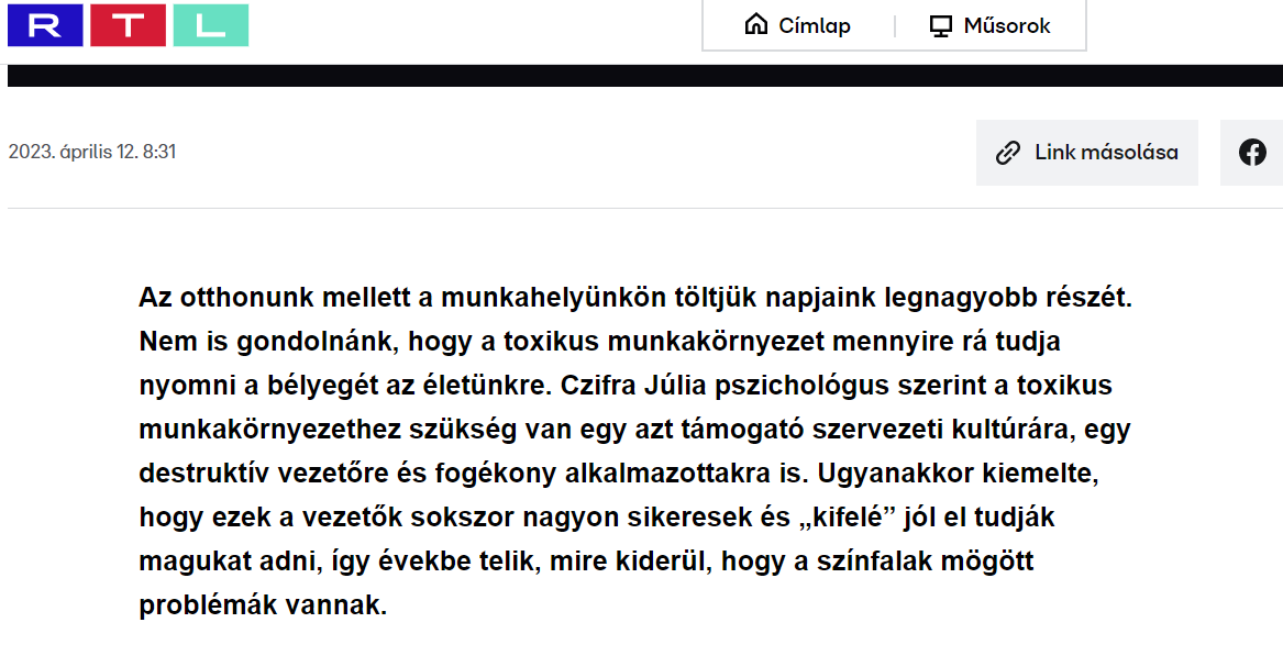 2023 április 12.-én az RTL Reggeli műsorában Szabó Zsófi és Miller Dávid a toxikus munkakörnyezet témáját érintette, ehhez behívtak 5 perc erejéig egy szakértői véleményre azzal kapcsolatban, mi okozza a toxikus munkakörnyezet kialakulását, mik ennek az összetevői, és van-e kapcsolat sikeres és toxikus munkahely között. Elmondtam, hogy kell hozzá egy támogató környezet, ahol nincsenek fékek, nincs megfelelő kontrol a vezetők felett, kell hozzá egy viselkedésében destruktív vezető, aki narcisztikus, erős hatalomvágy hatja és kiszámíthatatlan és kellenek hozzá fogékony követők, olyan alkalmazottak, akik támogatják az ilyen vezető fennmaradását. Az 5 perces jelenésem itt megtekinthető: https://rtl.hu/reggeli/2023/04/12/toxikus-munkahely-destruktiv-vezeto-czifra-julia